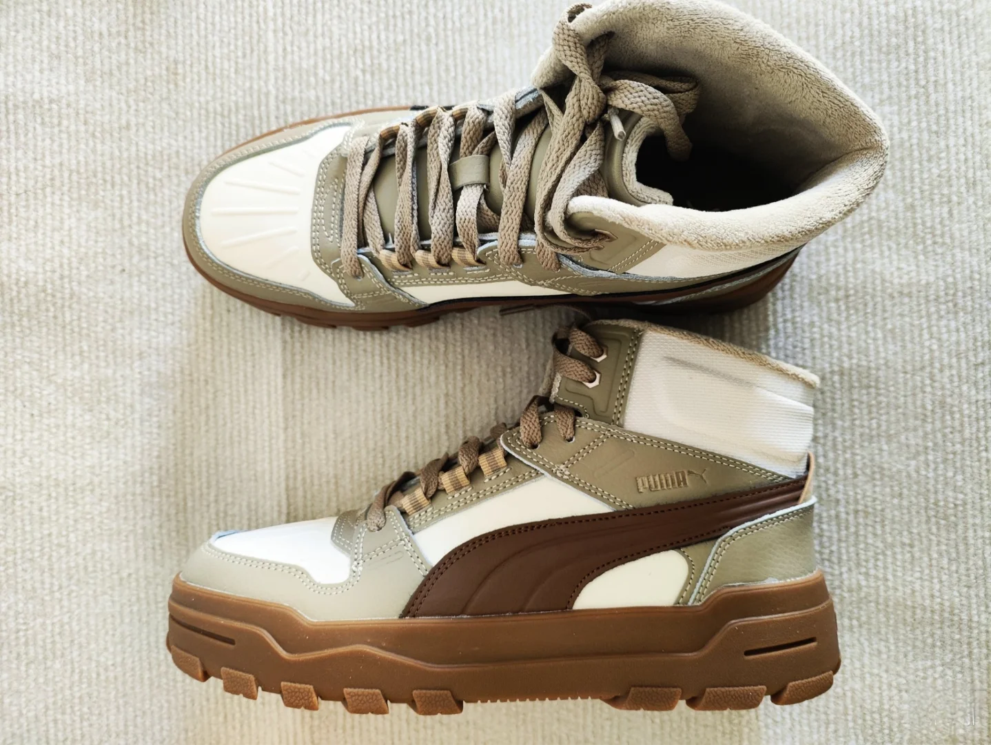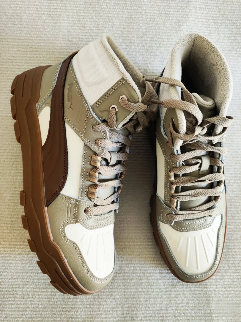 Комбинация дубового коричневого, молочно-белого и светло-бежевого оттенков создаёт осенне-зимний ретро-фильтр. Фирменная беговая полоса PUMA выполнена в виде тёмно-коричневого тиснения, носок украшен тиснёной кожей — качество ощущается на высшем уровне . Флисовая подкладка — сейчас как раз в тему: согревает, но не создаёт парникового эффекта.