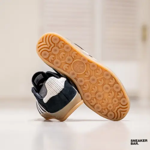 Эти низкие кроссовки выполнены в лаконичной черной цветовой гамме с контрастной бежевой подошвой, что создает эффектный и сдержанный образ. Материал верха — прочная замша, которая не только выглядит премиально, но и обеспечивает долговечность носки. Узнаваемая белая полоса Adidas по бокам и золотистый шильдик завершают фирменный дизайн. Модель идеально подходит для стиля лайфстайл, легко комбинируясь с джинсами, платьями или спортивными костюмами.