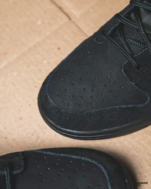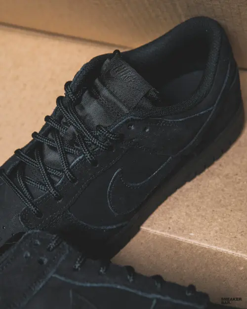 Данная версия выполнена в монохромной черной цветовой гамме, что делает ее невероятно универсальной и стильной. Верх изготовлен из премиальной замши, которая придает модели тактильную глубину, богатый внешний вид и обеспечивает долговечность. Низкий силуэт, характерный для линейки Dunk Low, подчеркивает чистоту линий и отлично сочетается с любым гардеробом — от повседневных джинсов до более строгих образов. Черная подошва завершает целостный и дерзкий образ.